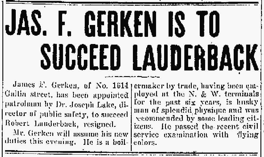 After the death of my great-great grandmother at the age of 30 from “consumption”, my great-great grandfather remarried and had a second family of four more children. The oldest was born in 1863 in Grafton, Taylor County, Virginia (West Virginia after June 20, 1863). James Francis Gerken grew up in Grafton, moving to Parkersburg as a young man to work for the Baltimore and Ohio Railroad as a boilermaker. He married, and had four children of his own. About 1908 he moved to Portsmouth, Scioto County, Ohio, where he worked as a boilermaker in the shops of the Norfolk & Western Railway.