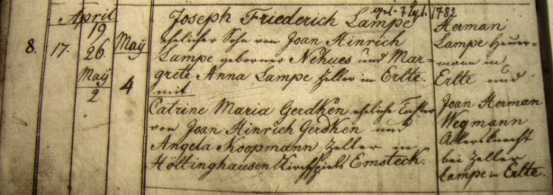 Lampe / Gerken — 1811 marriage record Johann Friederich Joseph Lampe or Niehaus to Catharina Maria Gerken Source: St. Vitus Katholische Kirche in Visbek, Niedersachsen, Germany Kirchenbuch, Volume 6, “Trauungen 1811-1837”, page 2, FHL microfilm 909906 Share this: Click to share on X (Opens in new window) X Click to share on Facebook (Opens in new window) Facebook Like Loading... Feel free to comment here: Cancel reply Δ This site uses Akismet to reduce spam. Learn how your comment data is processed.